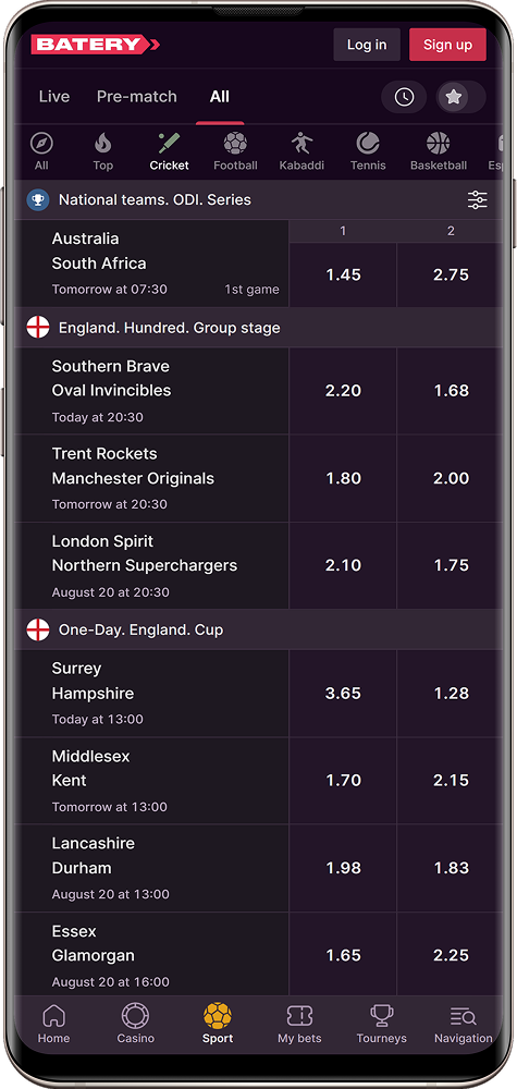 Logging into the Batery Bet app takes just a few steps. Authorization is required to place bets, make deposits, and use all the features of the app.