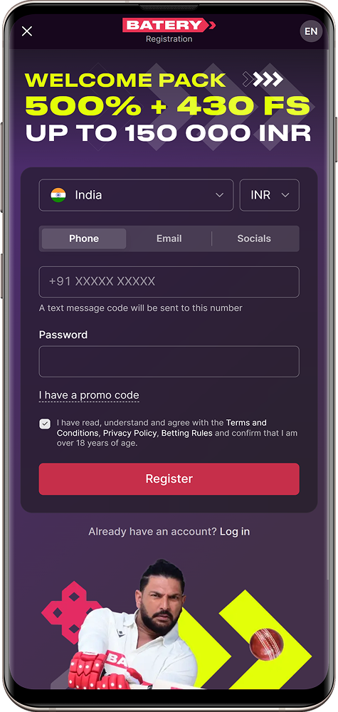 Registration via the Batery Bet mobile app takes just a couple of minutes and is available to every player in India. No additional software is required to create an account — everything happens directly in the Batery Bet app. Here’s how to register:
